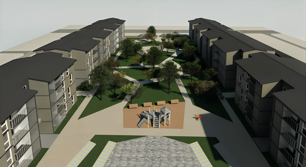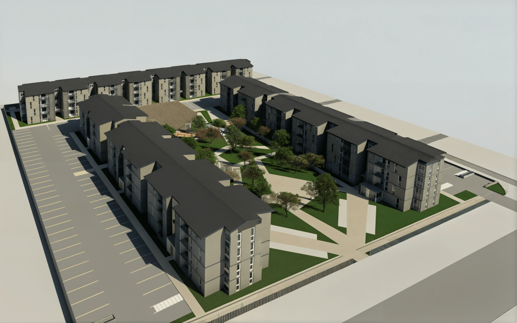 El proyecto cuenta con una cabida para 156 departamentos, tiene 3.750 m2 de áreas verdes, una sede social, equipamiento deportivo y de juegos, 145 estacionamientos y bicicleteros. Se utilizará la vivienda tipo industrializada certificada por la empresa Baumax (accede a ella aquí)